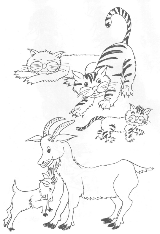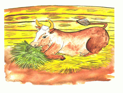 vom Stalldach herunter die Kuh Lisa beschimpft, weil sie aus Versehen auf einen