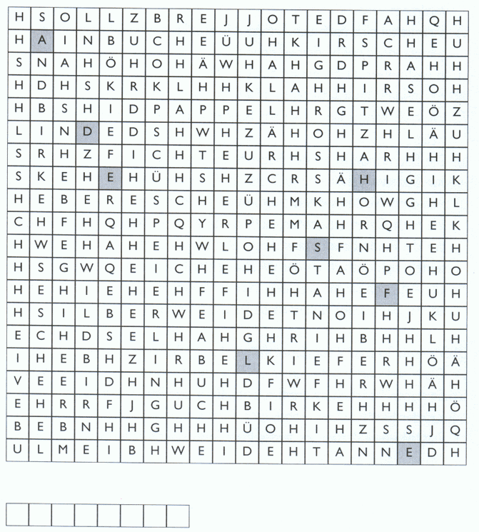 In diesem Suchrätsel sind 26 Bäume versteckt. Dabei sind auch die Bäume der Jahre 1989